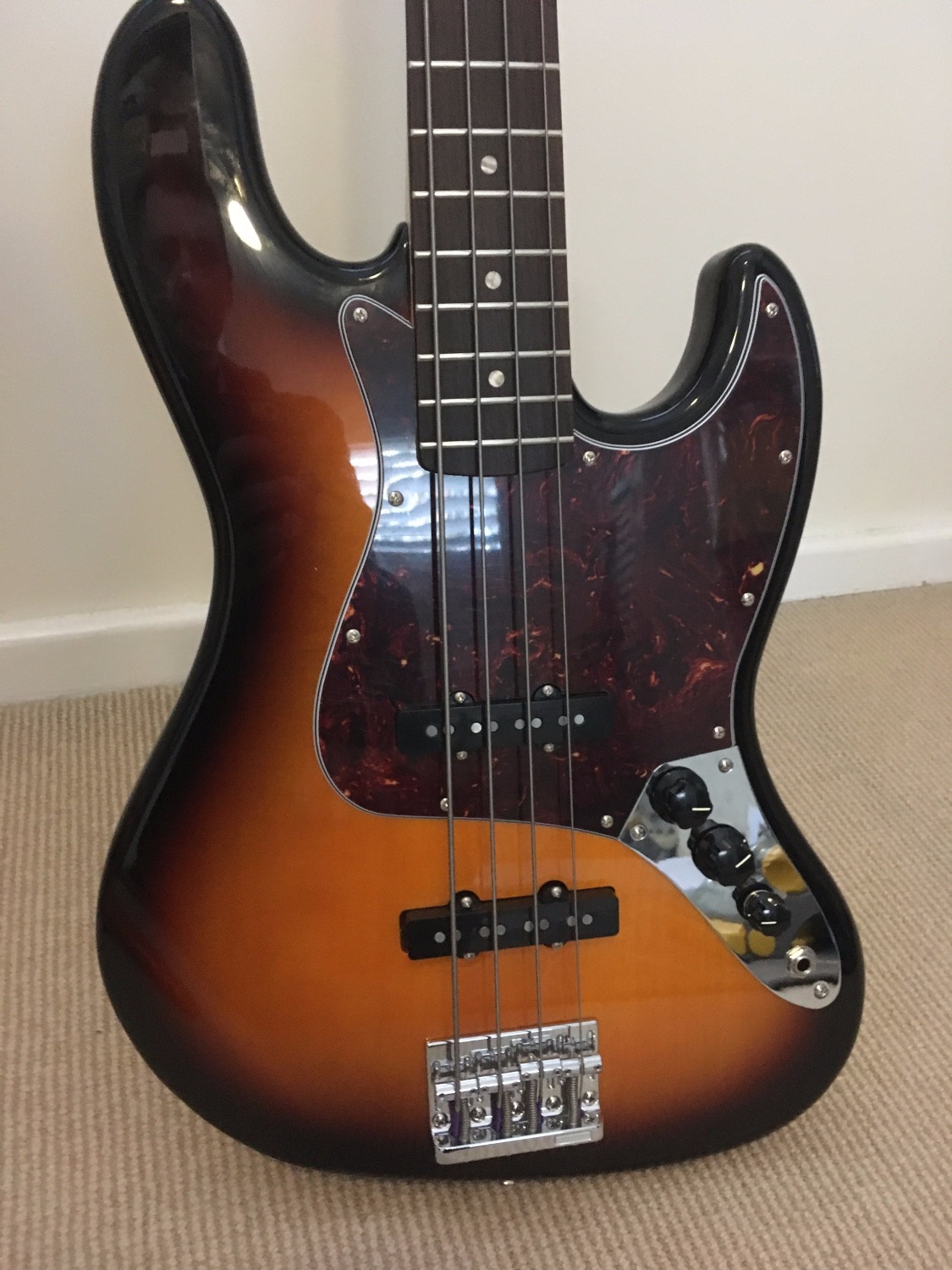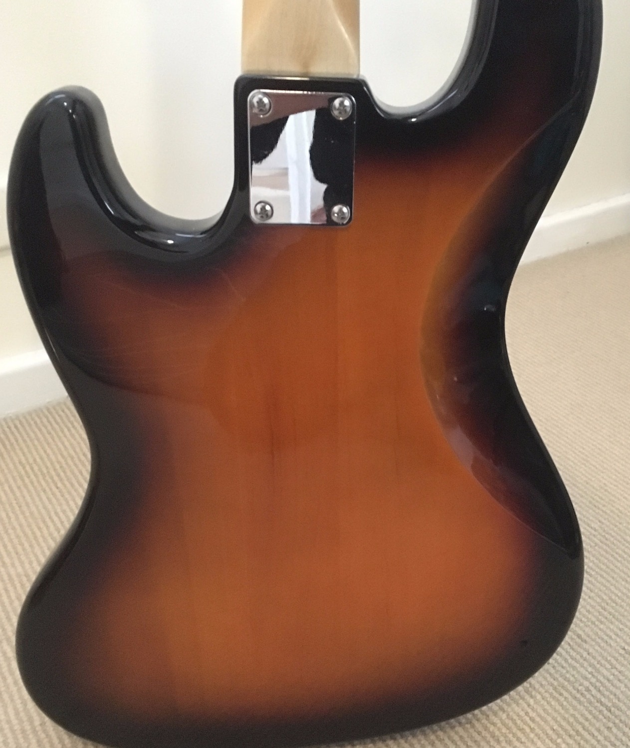 First off the rank a Fender Squier Jazz Bass upgrade project for someone. Neck refinished with FW old Baltic and a few thin coats of poly. Neck quality is similar to a Mighty-Mite neck. De-branded. Upgraded nut, machine heads, string tree and tuners. For the body - Gotoh high mass bridge, USA spec electronics, knobs, Tonerider pups and pickguard. All new screws etc. The body on this is Alder and very well matched considering. Interestingly the pup routes are same size as pickups (no large or swimming pool style) and are US Fender compatible, along with the screw holes for pickguard. It now feels and sounds not that different to a more expensive USA JB