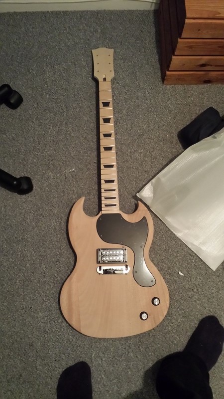 Its an SG Jr with maple neck and maple fretboard, routing for a normal humbucker and the input jack on the side of the guitar, rather than the front.