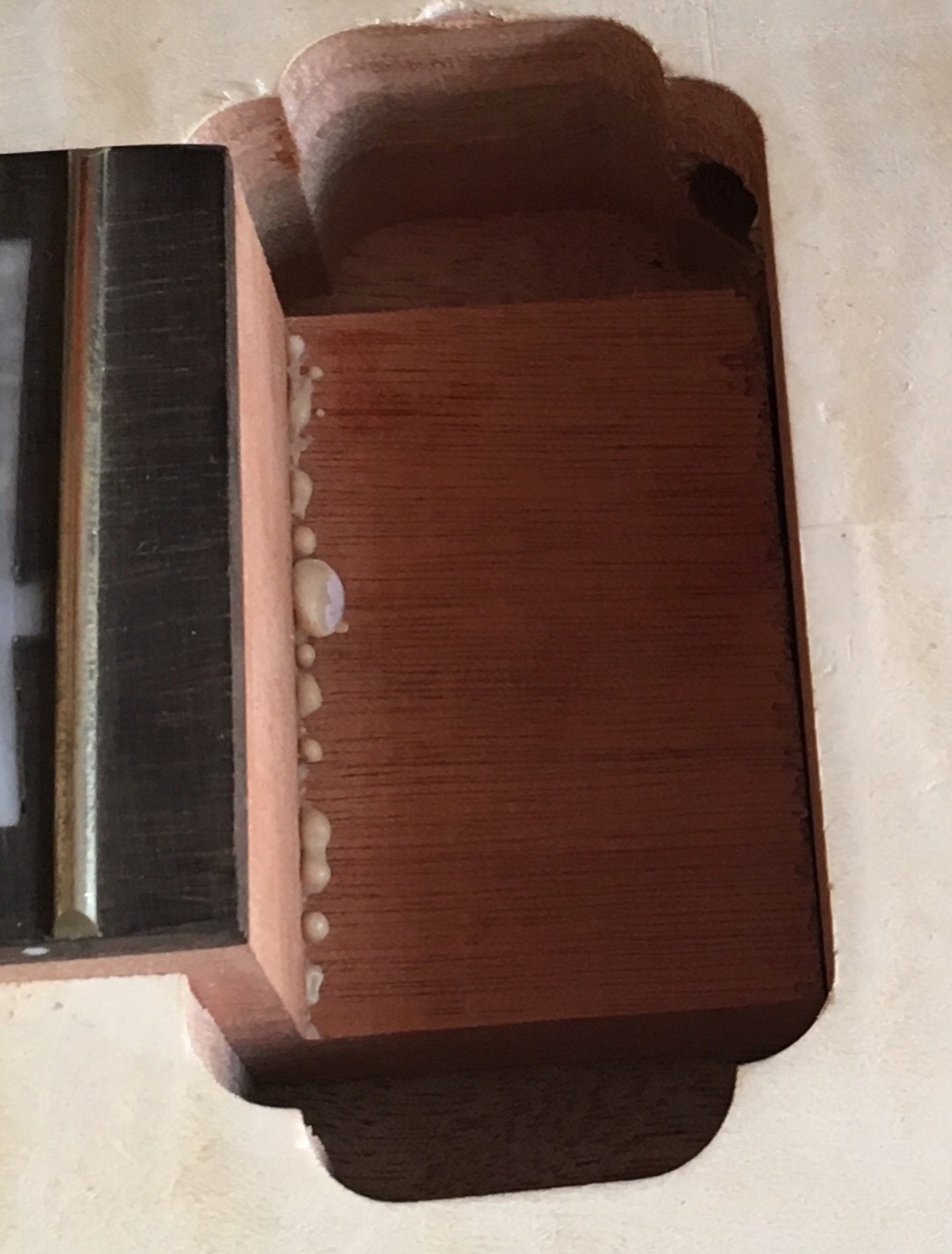 But before you do that, it's worth a quick mock-up. Use a G-clamp to clamp the neck tenon to the body in the rearmost position. Fit the two E tuners (don't bother with the anti-rotation screws yet). If you've already fitted the post holders in the holes, the keep the bridge fitted and run a top and bottom E-string up the neck. If not, then wrap the posts with tape until they're a firm fit in the holes and then fit the two E strings.