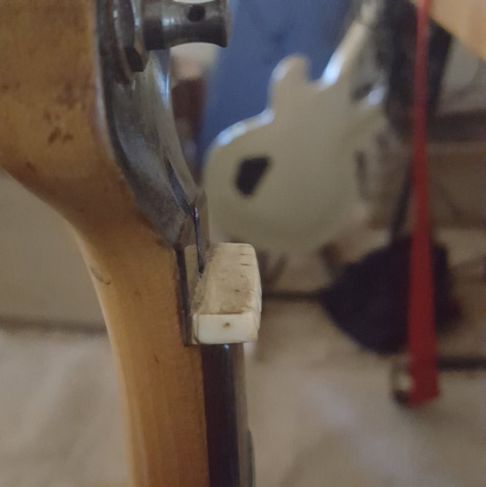 The nut may have been a roller nut to start out with (maybe a Fender LSR), which has since been fitted with a standard one.