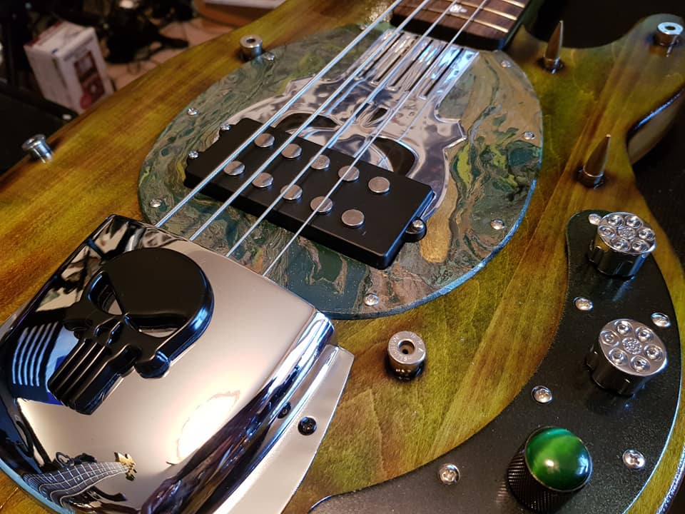 One of my fave Bass builds to date...A Shou Sugi Ban, olive stained MM5(4) String Punisher Bass with actual 303 Winchester's thru the body and a .50 Browning thru the headstock.