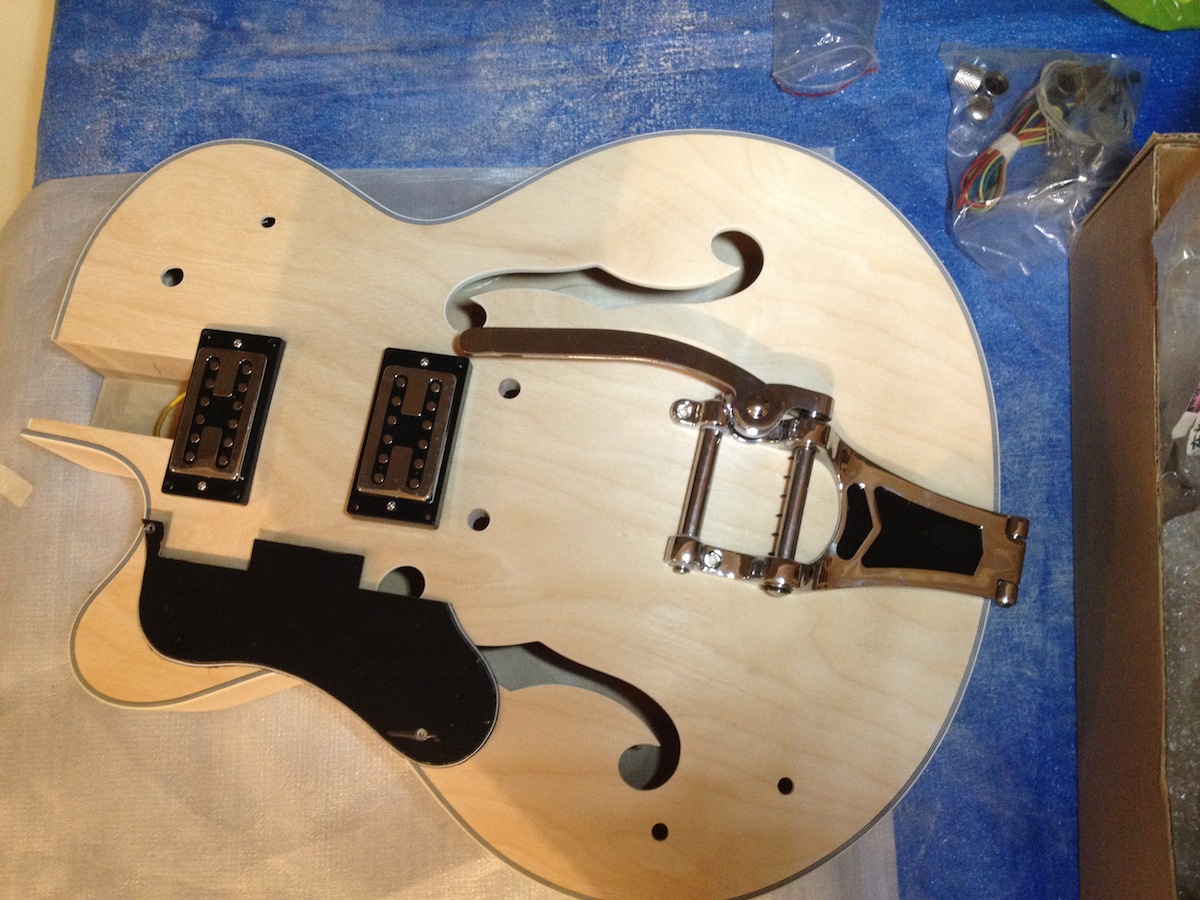 Opened the box very excited. Then when I placed all the components together I realised the tremolo was a right hand version! Adam then found that the factory didn't have a Left hand tremolo, so he sourced a real Bigsby Lefty ( at a discount cost). Thanks Adam. But now I had my first ever build that had to live up to it's hardware. No pressure.
