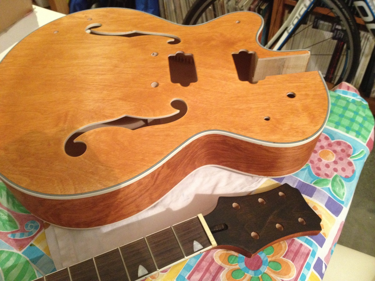 So a month ago, I decided I wanted to see the grain and I started researching finishes, and watching people spraying bursts in lacquer, and the Dingo tone videos and I emailed DingoBass with a couple of queries. I really liked his GR 1sf but then I saw an Ibanez Artcore vintage and thought that colour would be great. And not just a copy of DB's.