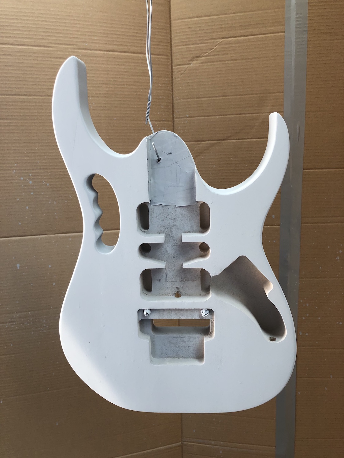 Once that was done, i tapped up the neck pocket and filled a couple of key holes and made a makeshift spray booth. I purchased the SCA Primer / Filler, White and Clear acrylic paints for the next step.