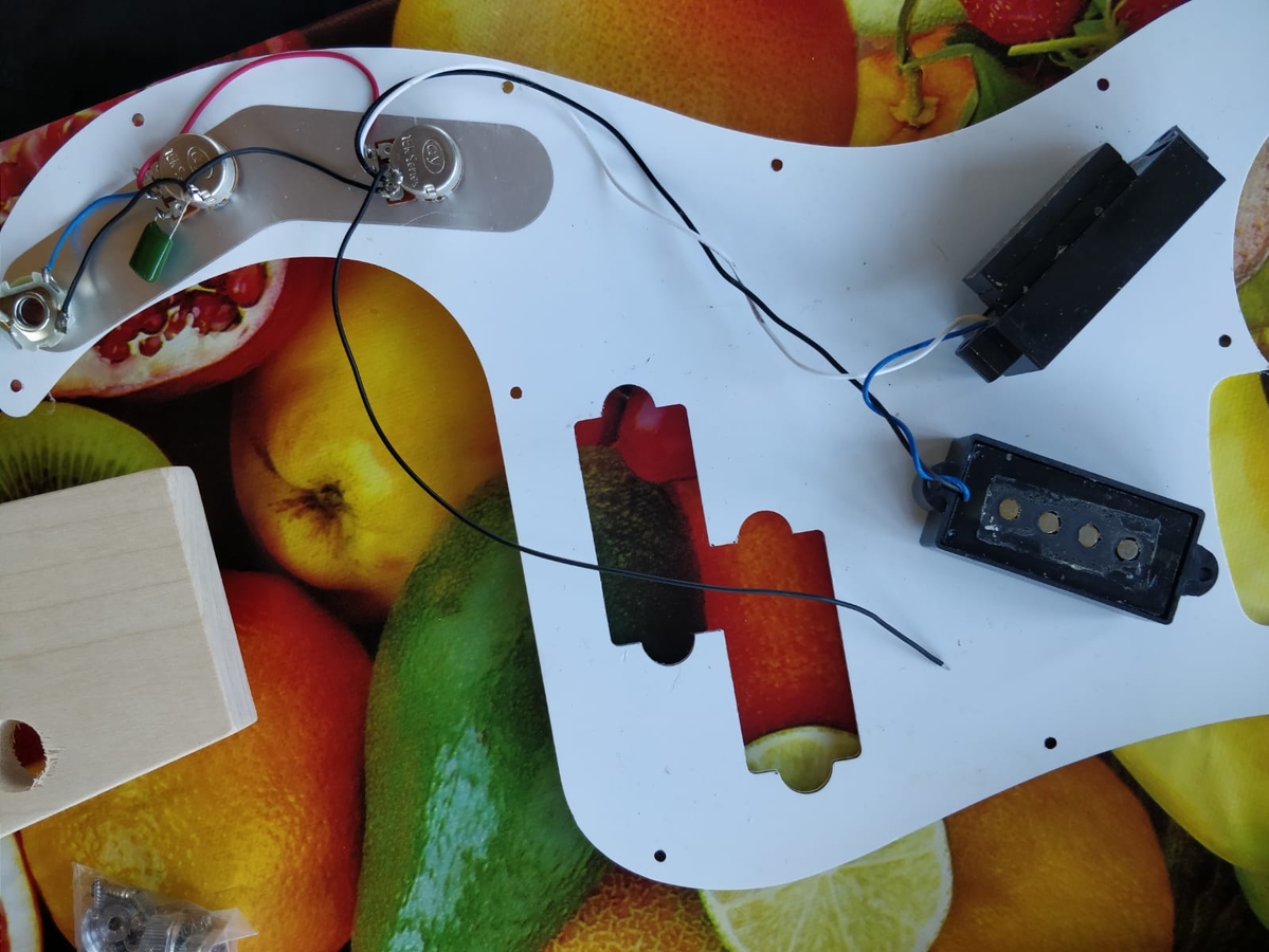 1) One of the pickups has 2 blocks stuck on the underside. These seem to raid the pickup enough, when its in it's place within the body, to be at the right height for when the scratch plate is on. The other pickup you can see does not have these blocks glued to it. Is that a mistake? if so, is there something I should be aware of before I stick some random wood to it to raise it?